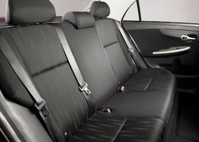 Toyota Corolla driving position and the front seat adjusted for a wider range of driver heights. Three interior color schemes are available: Ash, Dark Charcoal and bisque. Various storage can be reached easily, this includes dashboard center side pockets, a storage box above the glove box, door pockets front and rear that can hold 20-ounce bottle, a box with large-capacity main tray and a small accessory tray; an overhead console useful for storage of sunglasses or to open garage doors, and rear seat armrest with integral beverage place.